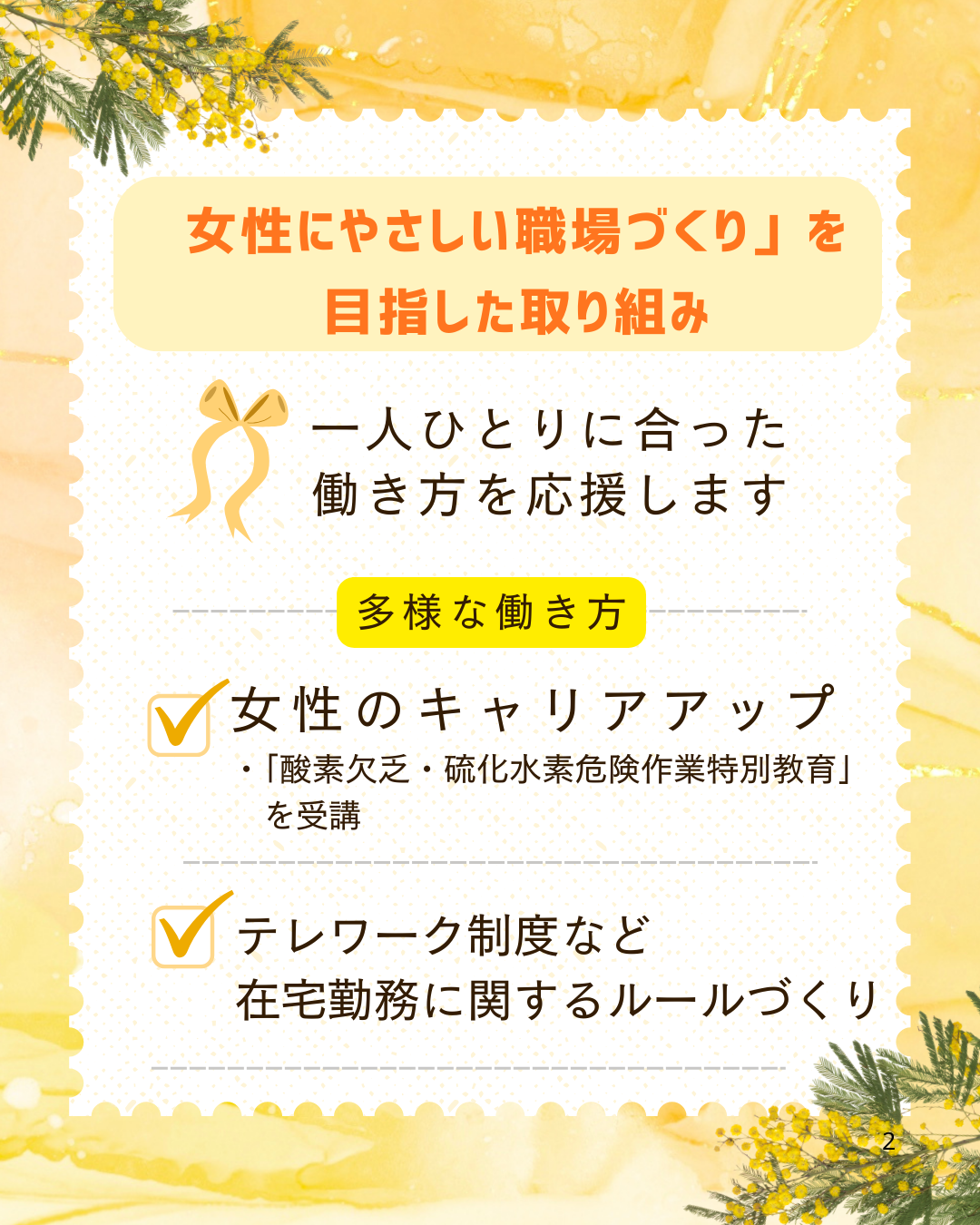 弊社では女性にやさしい職場づくりをめざし、様々な取り組みを行っています。