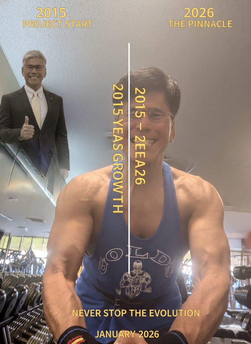 かつてのスーツ姿(2015年)から、現在の圧倒的なバイタリティ溢れる肉体へ。この変遷は、単なる維持ではなく、意志による「リバースエイジング」の証明です!11年前の自分を軽々と超え、細胞レベルで輝きを増す現在の笑顔こそが、プロジェクトの現在地です。NEVER STOP! 2026年は通過点に過ぎません。