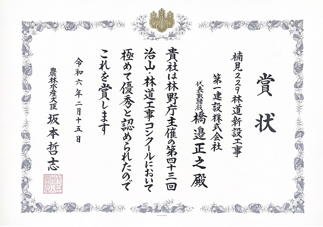 第43回 治山・林道工事コンクール 農林水産大臣賞 をいただきました