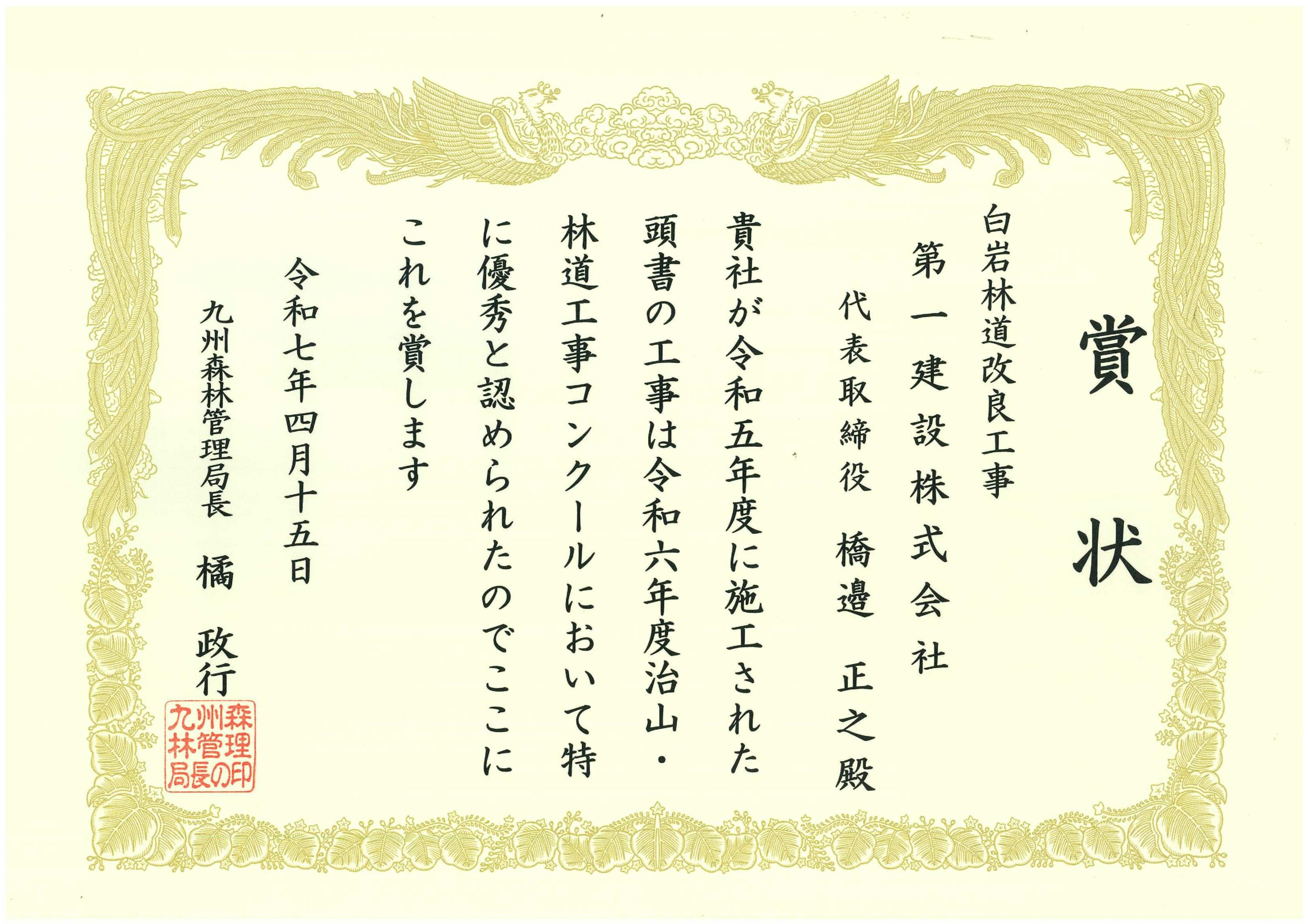 令和7年4月15日 白岩林道改良工事 令和6年度治山・林道工事コンクール 九州森林管理局長賞 をいただきました View this post on Instagram A post shared by 第一建設株式会社 (@daiichi_kensetsu.miyazaki) FacebookXBlueskyHatenaCopy